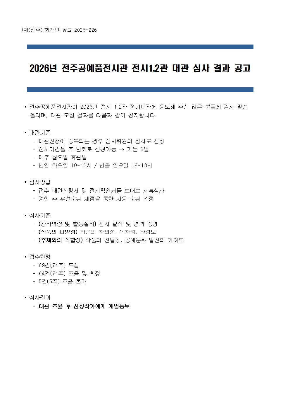 2026년 전주공예품전시관 전시1,2관 대관 모집 결과