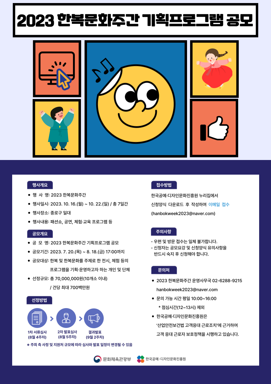 문화체육관광부가 주최하고 한국공예・디자인문화진흥원이 주관하는「2023 한복문화주간」기획 프로그램 공모를 통해 한복 및 한복문화를 향유할 수 있는 환경을 만들 수 있도록 지원하고자 합니다.