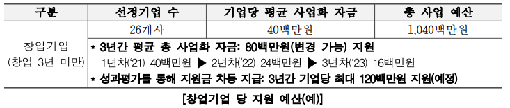 ※ 연도별 평균 사업화 자금 지원액(변경 가능) : 1년차(‘21) 40백만원 ▶ 2년차(’22) 24백만원 ▶ 3년차(‘23) 16백만원