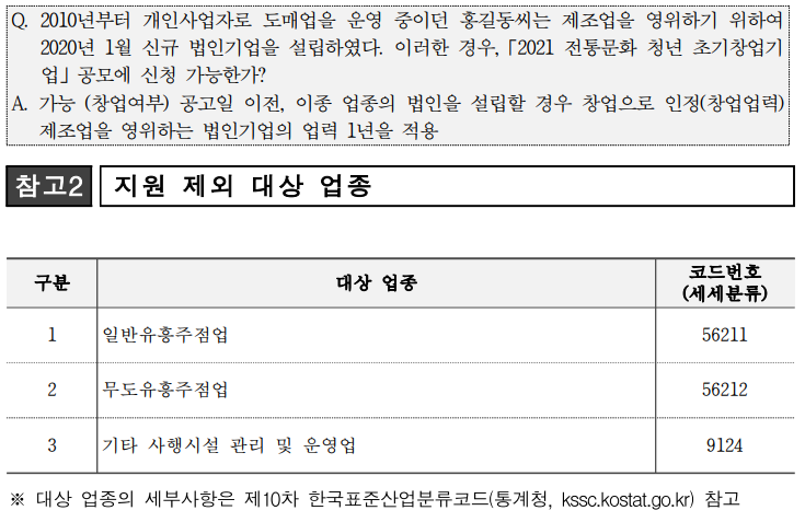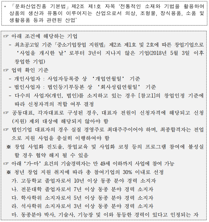 ○ 최초공고일 기준(2021.5.3.) 전통문화산업* 업력 3년 이내 창업기업의 대표자로서, 만 39세 이하인 자