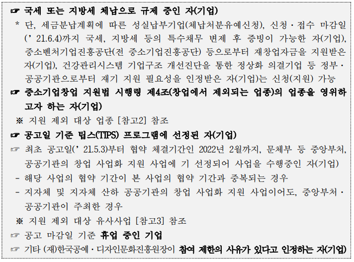 ※ 선정 완료 후 공동대표 또는 각자대표에 대한 신청자격을 재검토하여 신청 제외 대상으로 확인되는 경우, 참여 제한 및