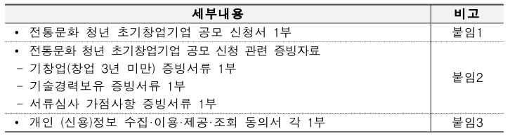 2. 전통문화 청년 창업기업 공모 신청 관련 증빙자료 각 1부