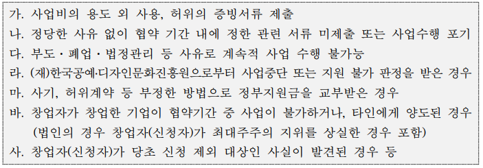 ○ (재)한국공예ㆍ디자인문화진흥원과 창업기획자(AC)는 선정된 창업기업의 사업비 횡령, 편취 등 용도 외 사업비 집행으로 인한