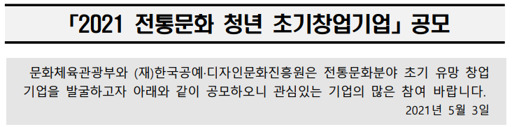 ○ 공 모 명 : 2021 전통문화 청년 초기창업기업 공모