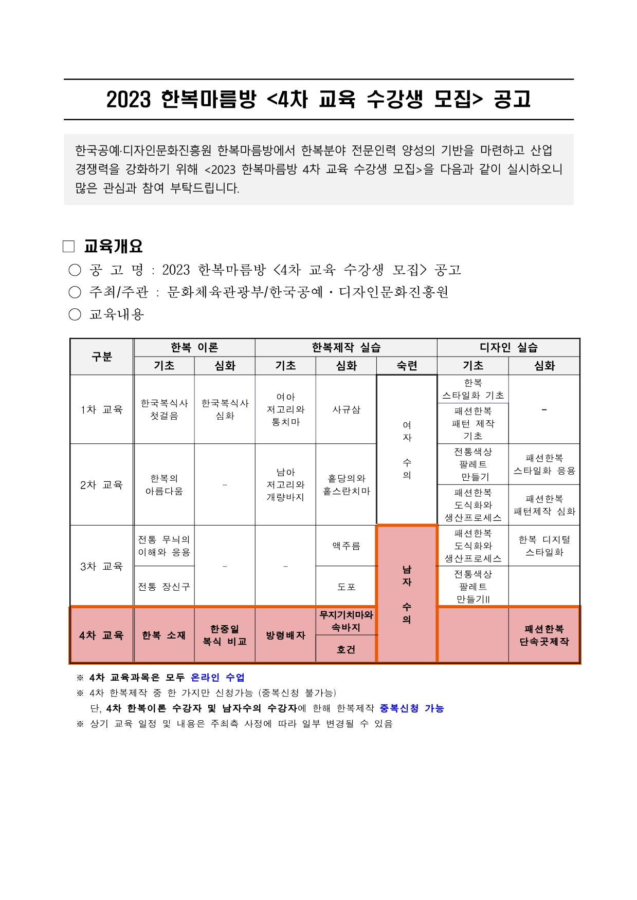 2023 한복마름방 <4차 교육 수강생 모집> 공고 |