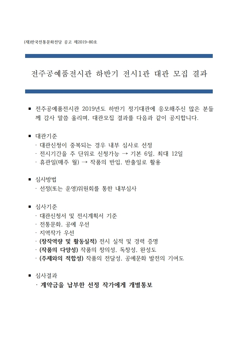 전주공예품전시관 하반기 전시1관 대관모집 결과